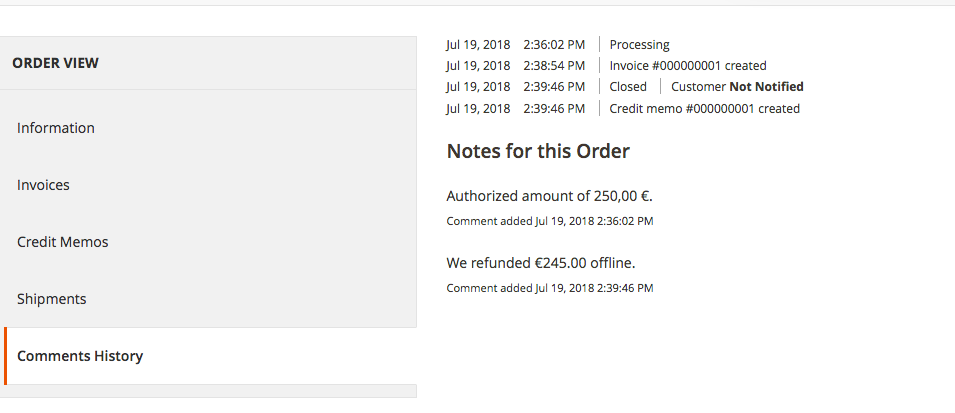 Each comment contains the time at which the action took place, a description of the respective action and whether the customer was informed or not.