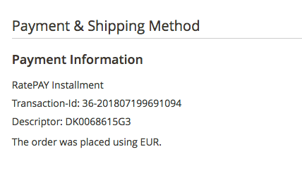 After selecting an order, a detailed view of this order appears. The Payment Information indicates orders placed with Ratepay.