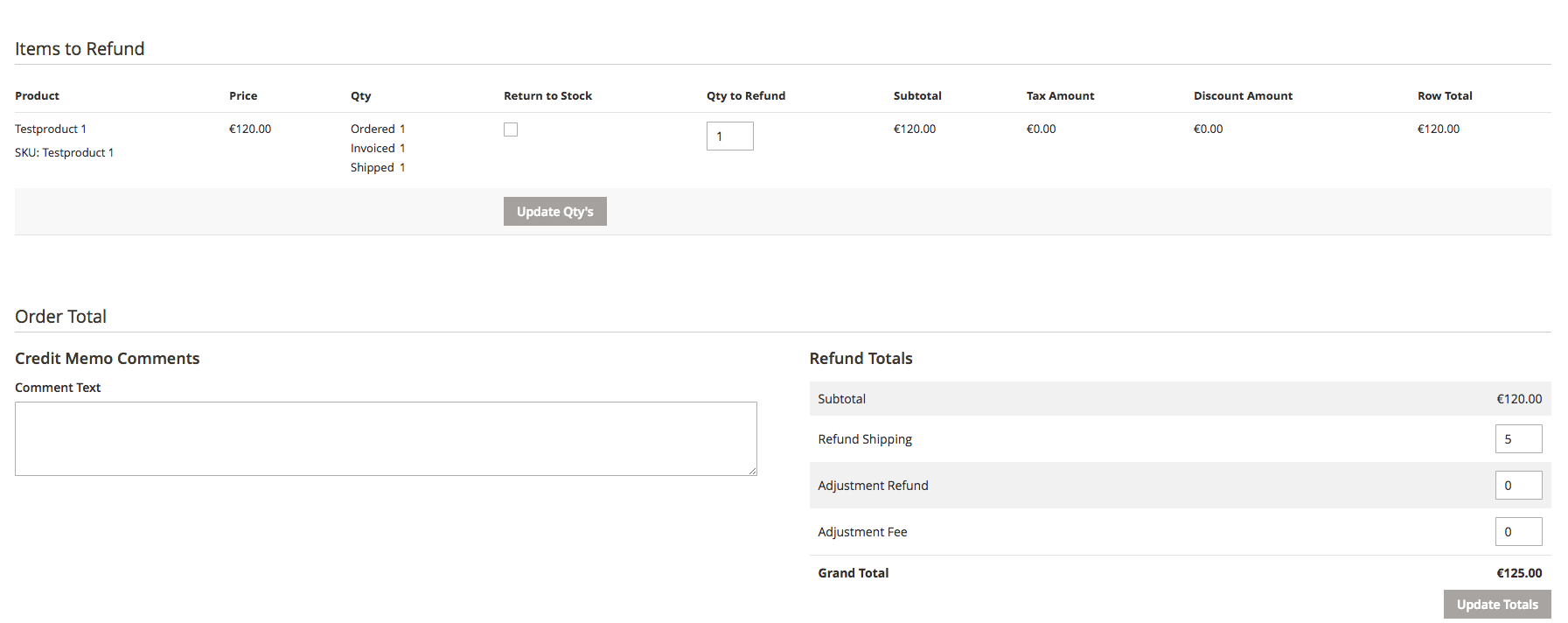 To enter a credit memo click Credit memo in the order view and enter the Euro amount under Adjustment refund. Do not forget to set the quantity of items to zero. If you click on Refund, the credit will be generated.
