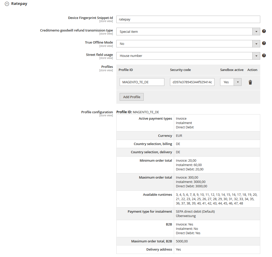 | Profile configuration | Profil Konfiguration | Here you can find all configuration entries per Ratepay profile. |