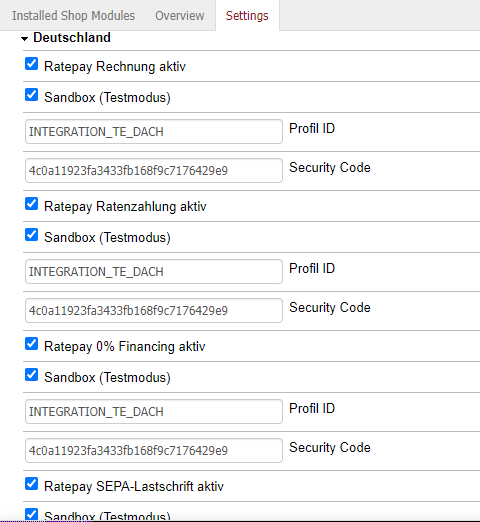- For Germany all Ratepay payment-methods are supported and so activated on this sample-screenshot. The available Ratepay payment-methods, which are contractually agreed, you may identify in the "Verbindungstest ..."-table in the first screenshot of this chapter.