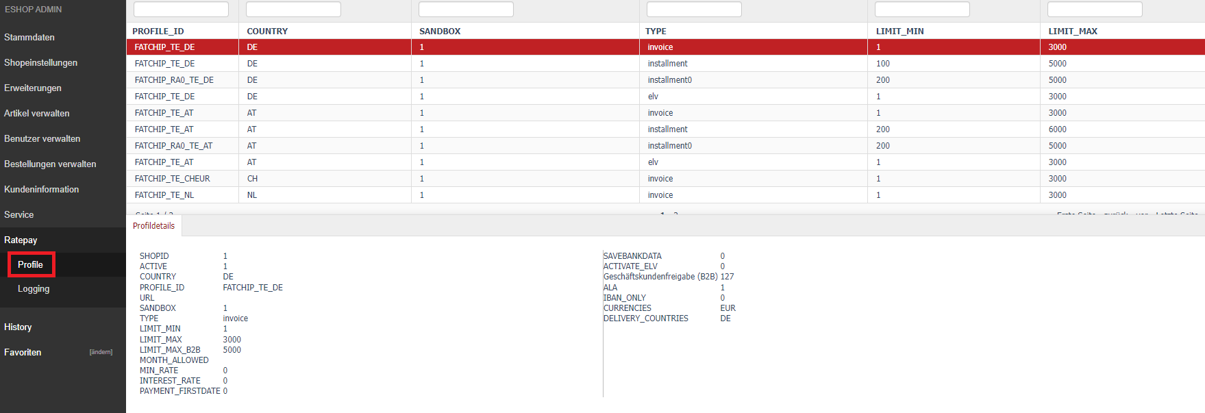 If you want to check the to current Ratepay profile configuration you can find them via the OXID sidebar Ratepay -> Profile: