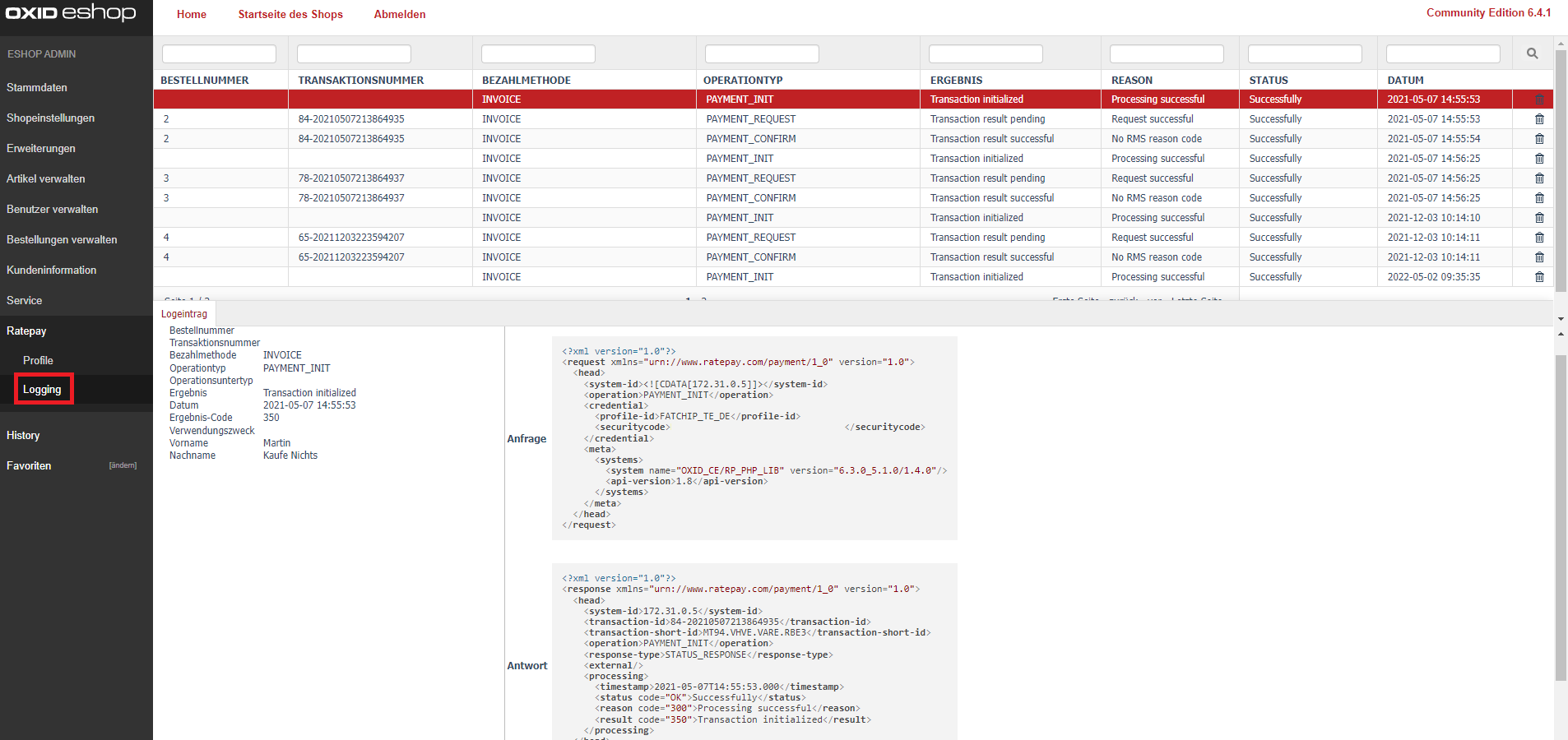 For research and error handling purposes we provide and Ratepay API logging function directly within OXID. You can find the API-log entries via the OXID sidebar Ratepay -> Logging: