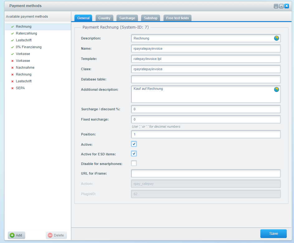 Simply tick the Active checkbox to disable and enable the Ratepay payment methods on your website.
