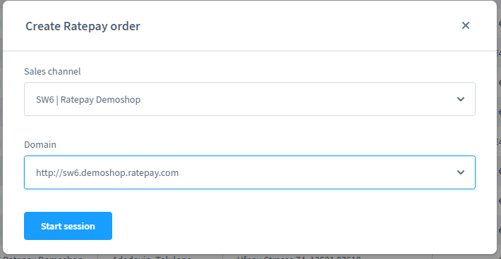You can initiate the admin orders with Ratepay payment methods in the order overview. To access, click on Orders -> Overview and then "Create Ratepay order" in the top right corner.