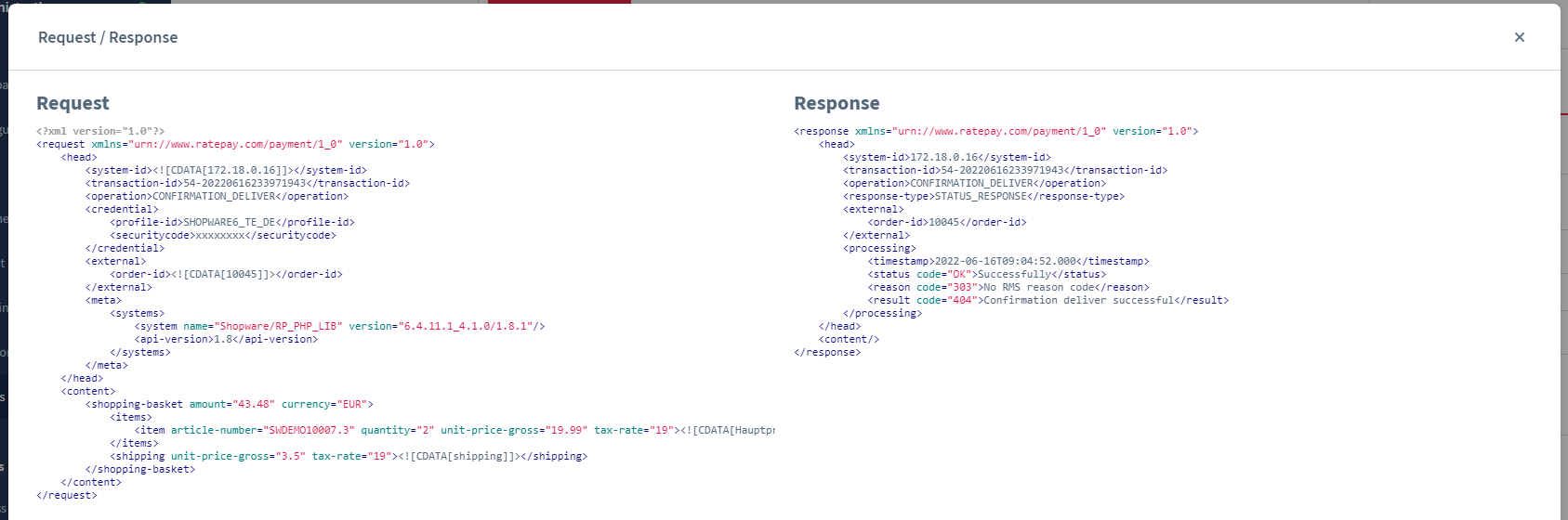 CONFIRMATION_DELIVER | Capture | Announcement of shipment towards Ratepay. |