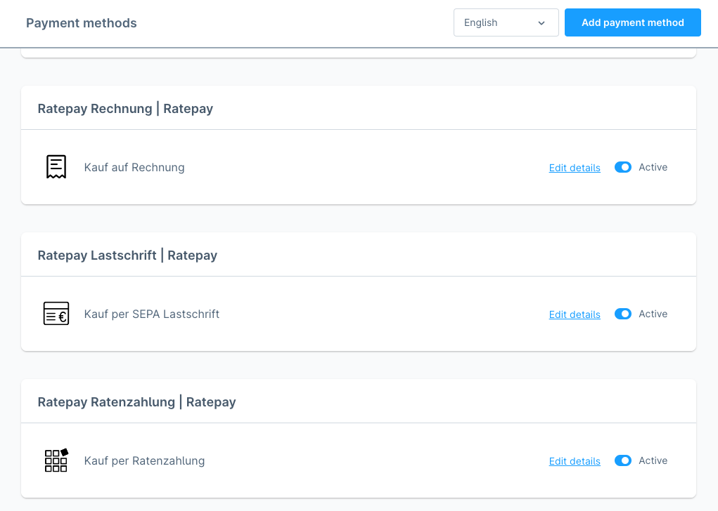 Simply tick the Active checkbox to disable and enable the Ratepay payment methods and assign them to your sales channel.