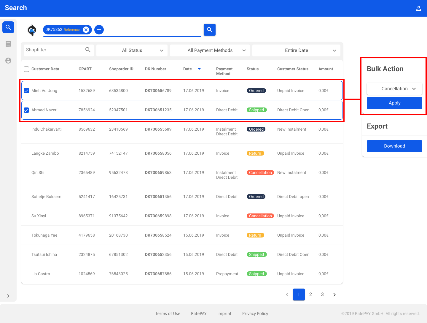 Select all transactions individually and change the status of all selected orders at once.