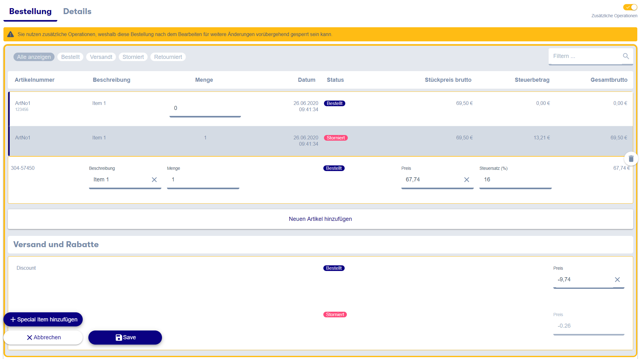 Now cancel the items and add it with correct values: