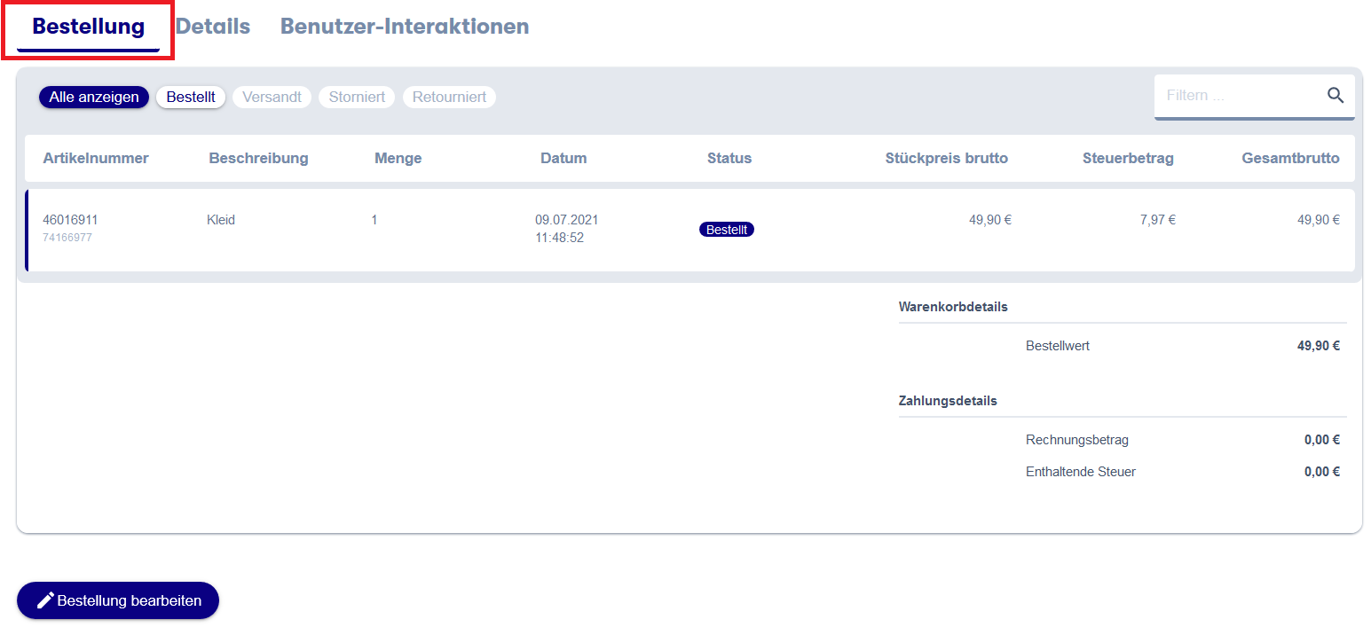 If you want to see the customer data, payment status, order details or sent correspondences, please click on the tab "Details":