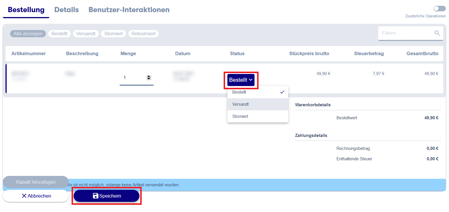 To initiate a follow-up operation, please click on "Edit order" at the bottom-left. You can then set the desired status directly in the item positions. Click on "Save" to confirm the change: