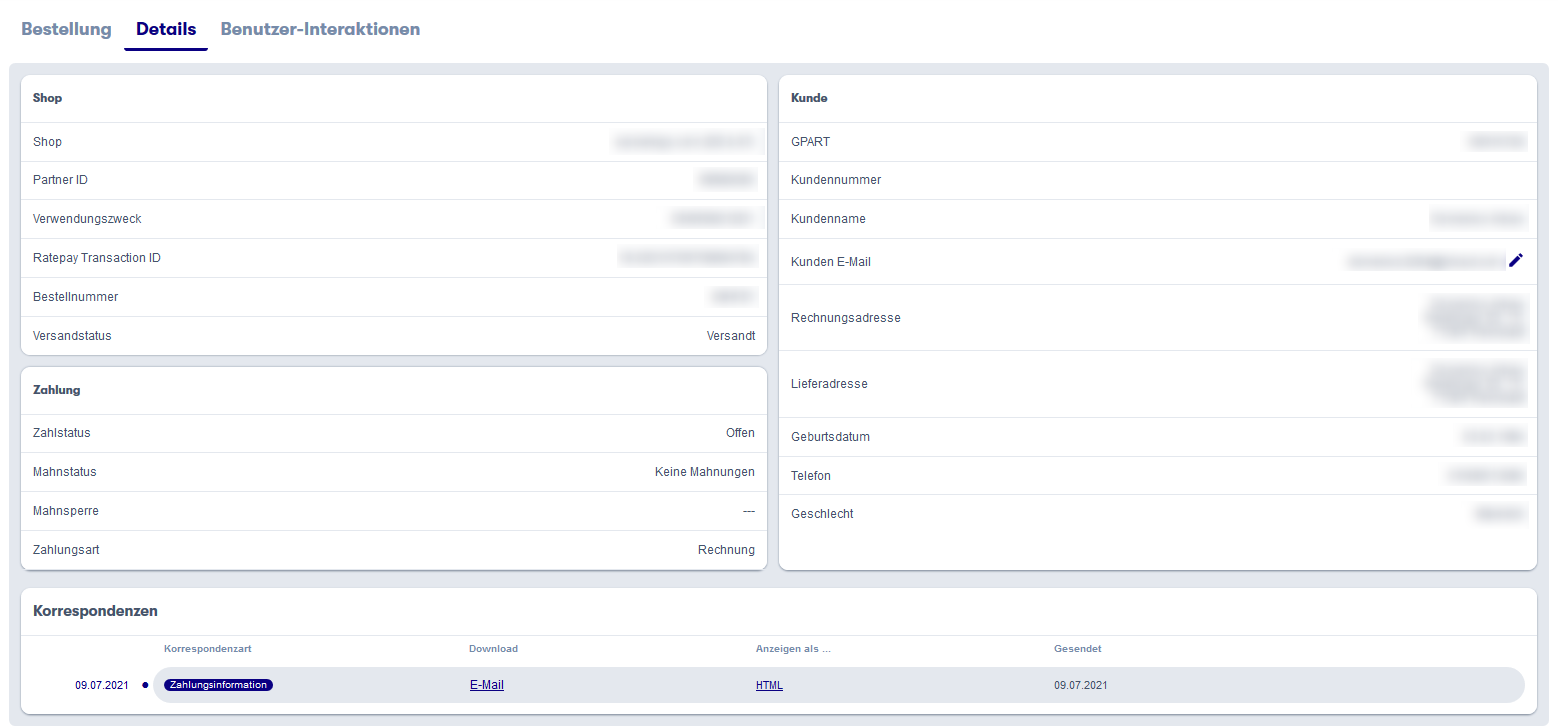 At the bottom you can see the correspondences which Ratepay sent in behalf of you. You can also download these correspondences and sent them again to the customer.