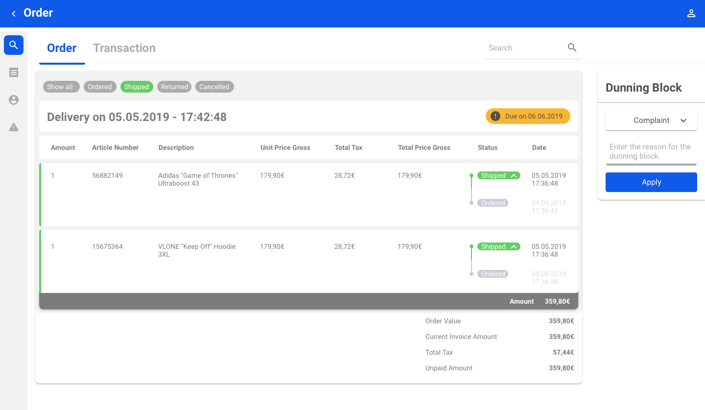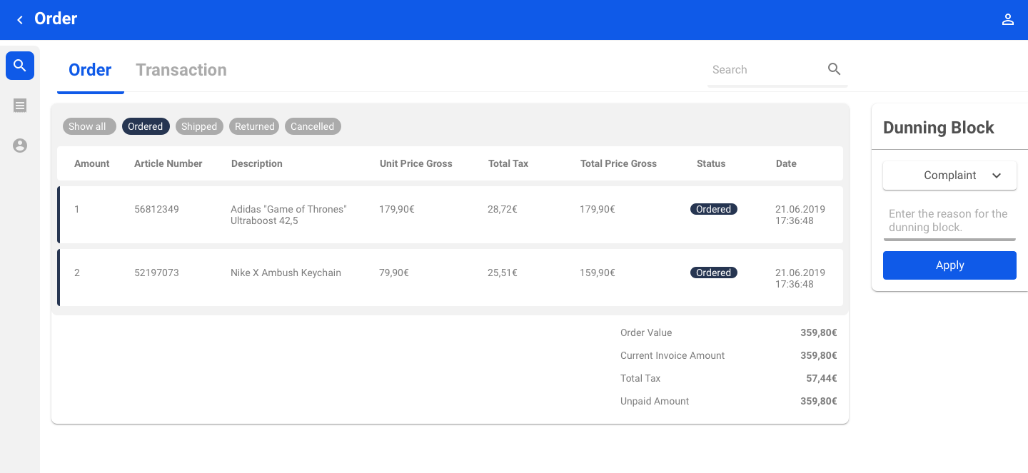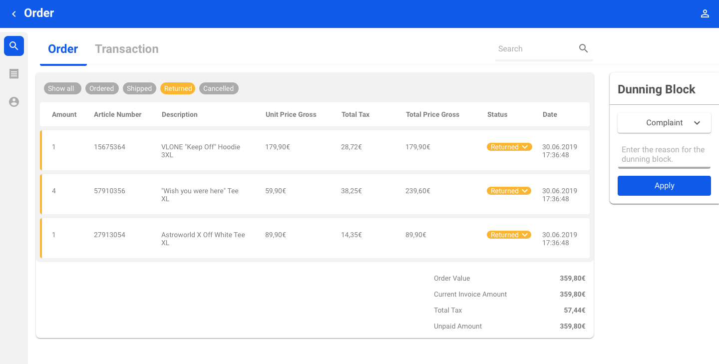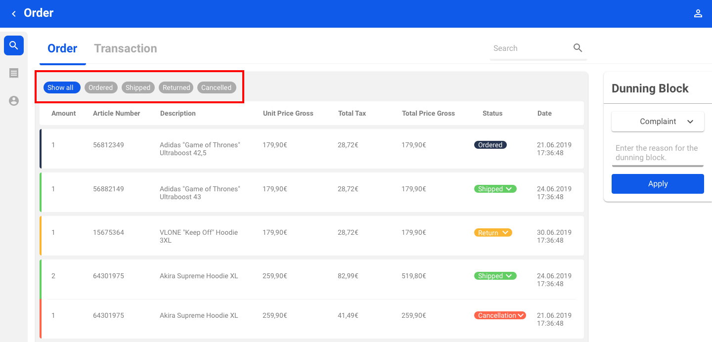 Sie können alle Positionen eines Auftrags nach Status filtern, die bestellt, versandt, retourniert und storniert wurden. Die komplette Bestellung wird im Filter Alle anzeigen angezeigt.