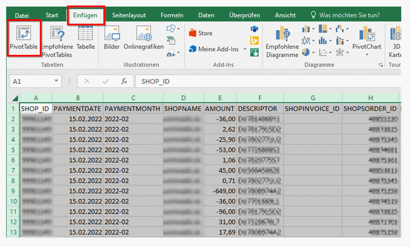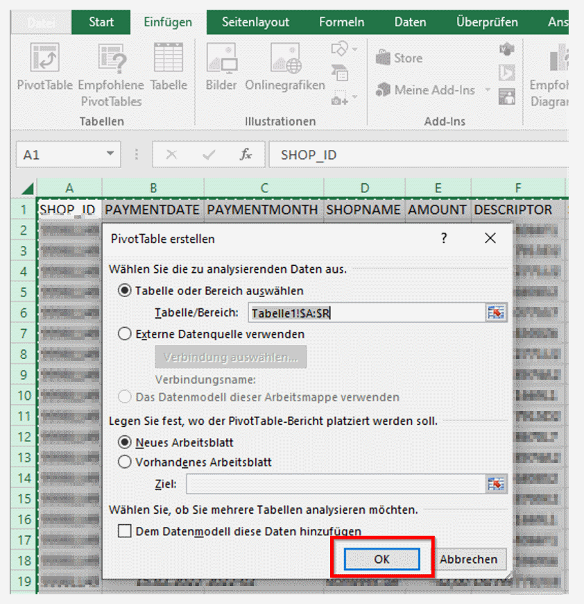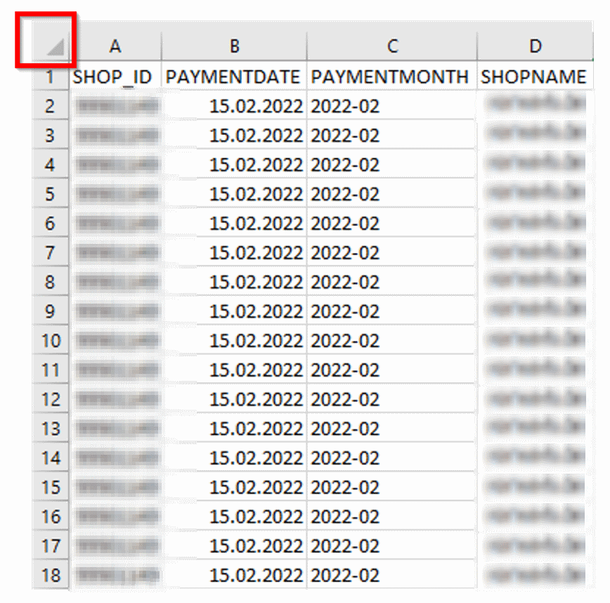 - In the sheet containing the imported settlement report, mark all data by pressing the Select All button (or use the keyboard shortcut CTRL + A)