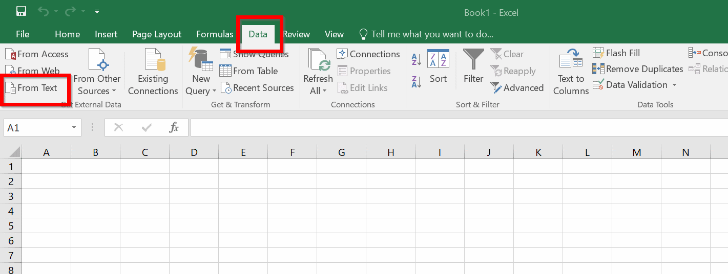 - Under the "Data" tab, press "From Text" from the "Get External Data" group