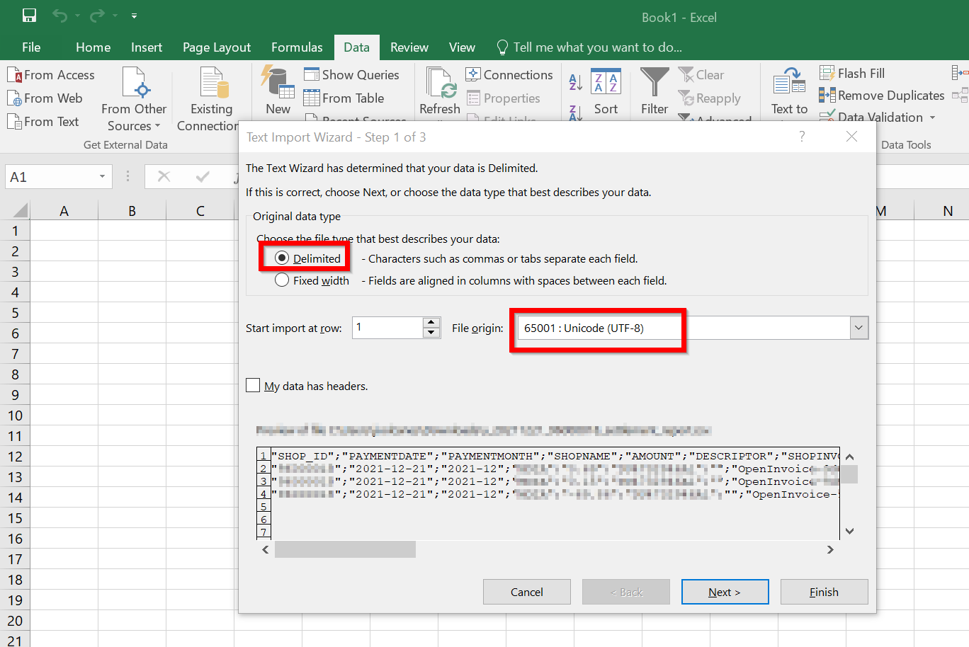 - Confirm that "Delimited" is selected in the Original data type. If your settlement report contains special characters (German umlauts) you need to select File Origin (Dateiursprung) "65001: Unicode (UTF-8)" from the drop-down menu and press "Next"