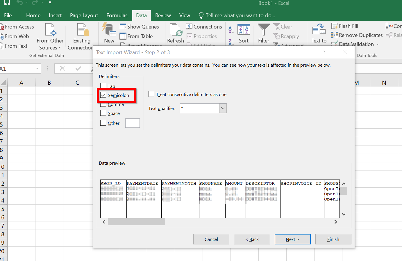 - Make sure that only "Semicolon" is selected and press "Next"