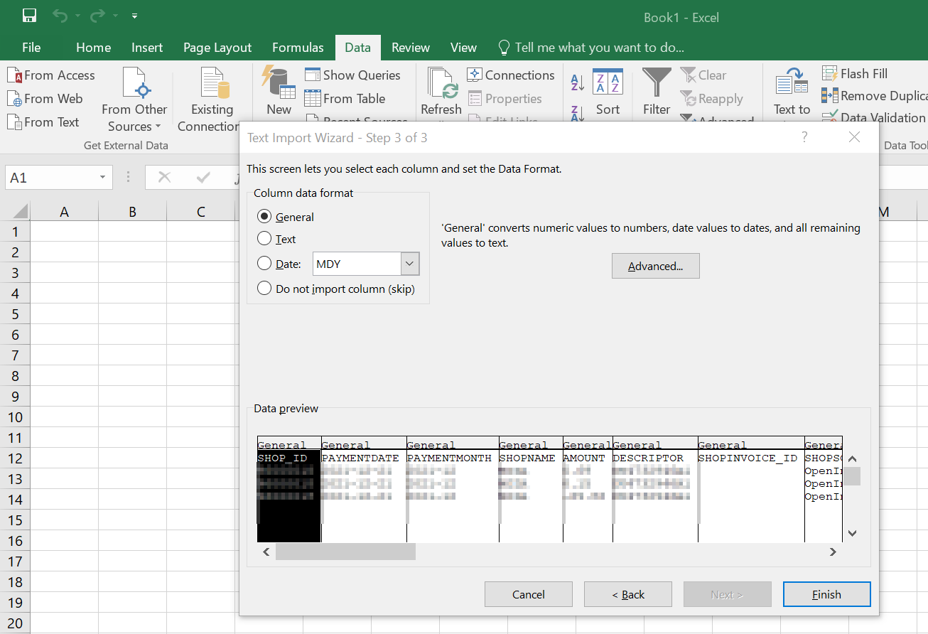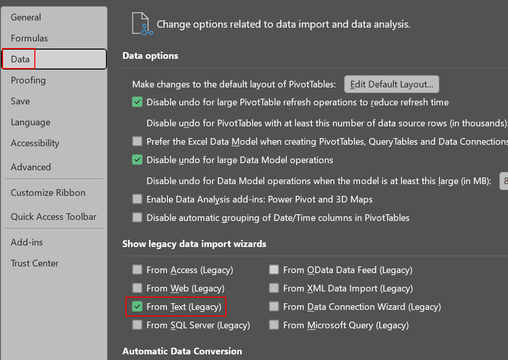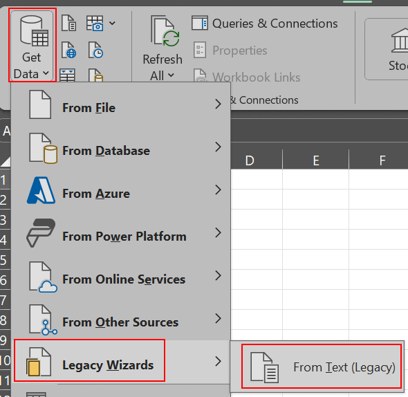 - Under the "Data" tab, select "Get Data" -> "Legacy Wizards" -> "From Text (Legacy)" from the "Get & Transform Data" group