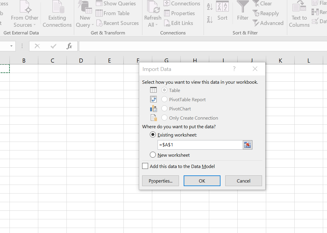 - Select where to put the data ( =$A$1) and press "OK"